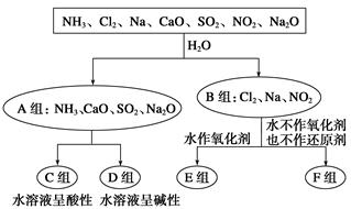 本题解析:(1)分析两组物质与水的反应情况可知,第一级分类标准是是否发生氧化还原反应;(2)NO2与水反应时,水既不作氧化剂又不作还原剂;(3)D组氨水呈弱碱性的原因是NH3·H2O