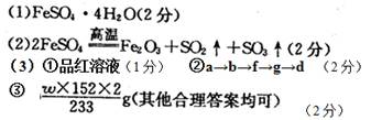 假设完全正确 (3)①②按气流方向连接各仪器,用字母表示接口的连接顺序:加热FeSO4分解生成Fe2O3、SO2及SO3,结合两气体物质的性质及检验方法可知,SO2一般用品红溶液来检验,SO3易冷凝,再有就是两气体均可污染空气,所以试剂X为品红溶液,所给装置的连接顺序为:c→a→b→f→g→d ③由关系式2FeSO4~SO3~BaSO4可知,BaSO4的质量为Wg,分解的FeSO4的质量为