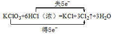 5、填空题 (10分)在KClO3+6 H Cl(浓)=KCl+3Cl2↑+3H2O的反应中,氧化剂是___________,还原产物是_________,得电子与失电子个数比是____________,氧化产物与还原产物的质量比是________,试标出反应电子转移方向和数目_________________________