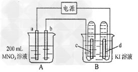 (2)电解开始时,在B烧杯的中央滴几滴淀粉溶液,你能观察到的现象是__________电解进行一段时间后,罩在c极上的试管中也收集到了气体,此时c极上的电极反应为:_____________。