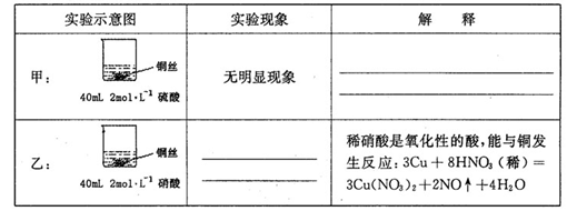 4、实验题 某同学在学习硝酸与硫酸时,对两种酸与铜的反应情况进行研究,试完成下列各题。 (1)在甲、乙两个烧杯中,分别装入40mL浓度均为2mol·L-1的稀硫酸和稀硝酸,并向其中各加入 4g束状铜丝,观察现象,试完成下列实验报告: