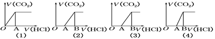 3、选择题 向某NaOH溶液中通入CO2气体后得溶液M,因CO2通入量的不同,溶液M的组成也不同。若向M中逐滴加入盐酸,产生的气体体积V(CO2)与加入盐酸的体积V(HCl)的关系有下列图示四种情况,且(2)、(3)、(4)图中分别有OA﹕AB=2﹕3, OA=AB, OA﹕AB=3﹕2,则下列分析与判断不正确的是(忽略CO2的溶解)(?)