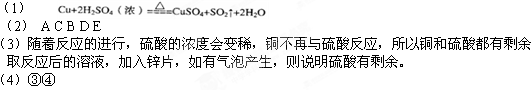 ⑶稀硫酸与铜不反应,所以随反应的进行,硫酸浓度变稀,铜和硫酸都有剩余;取反应后的溶液,加入锌等活泼金属,有气泡产生,检验气体,有爆鸣声,说明硫酸有剩余。