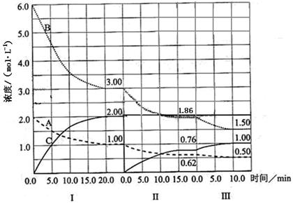 3、填空题 (16分)在一个固定体积的密闭容器中发生某反应,当改变其他反应条件,在I、II、III阶段,体系中各物质浓度随时间变化的曲线如下图所示: