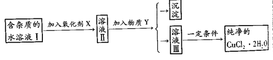 5、填空题 (10分)已知H2O2、KMnO4、NaClO、K2Cr2O7均具有强氧化性。将溶液中的Cu2+、Fe2+、Fe3+沉淀为氢氧化物,所需溶液的pH分别为6.4、6.4、3.7。现由含FeCl2杂质的氯化铜晶体(CuCl2·2H2O),为制取纯净的CuCl2·2H2O,首先将其配制成水溶液,然后按图示步骤进行提纯: