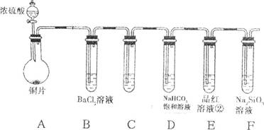 本题解析:(1)反应装置A中为浓硫酸与铜在加热条件下反应,故反应方程式为Cu+2H2SO4(浓) CuSO4+SO2↑+2H2O (2)A选项,氢氧化钠与二氧化硫无现象,错误。B选项,正确,二氧化硫具有还原性,能使酸性高锰酸钾溶液褪色,可验证二氧化硫的还原性。C选项,不发生反应。无现象。错误。故选择B选项。离子反应方程式为2MnO4-+5SO2+2H2O═2Mn2++5SO42-+4H+。溶液褪色,证明二氧化硫具有还原性。操作名称为洗气。(3)在D反应器中,二氧化硫与碳酸氢钠溶液发生反应,产生二氧化碳,到达E反应器中,二氧化碳不能使品红褪色,但二氧化碳可以和硅酸钠溶液反应,产生硅酸沉淀,可证明碳酸的酸性强于硅酸,故碳的非金属性强于硅的非金属性。故实验现象为 E中的品红不褪色,F中有白色沉淀生成。(4)B中通入氯气,可将亚硫酸根氧化为硫酸根,产生白色沉淀。故其反应方程式为Ba2++Cl2+2H2O+SO2= BaSO4↓+4H++2 Cl-。
