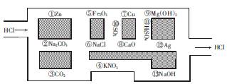 3、填空题 (8分)“走迷宫”是深受大众欢迎的益智游戏,某同学以“盐酸”的身份走人化学迷宫,迷宫里有许多“吃人的野兽”(即能与盐酸反应的物质或者是水溶液),盐酸必须避开它们,否则就无法通过。