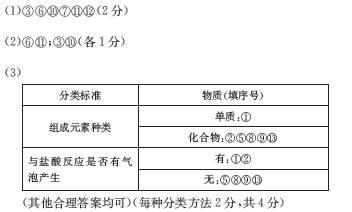 (3)请根据不同的分类标准将图中能与盐酸反应的物质分为两类,结果填在下表中: