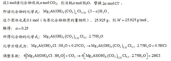 发现:消耗Cl0.132 mol,而26.65 g固体本身只有0.1 mol,即固体中只有0.1 mol Cl ,明显不符合题意。也就是说就算Cl全部转化为碳酸根,都无法得到25.925 g固体。设1 mol该化合物吸收a mol CO2,则消耗a mol H2O,替换2a mol Cl 。即该化合物的化学式:
