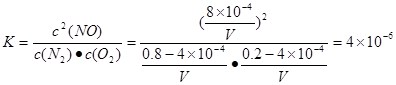n(O2)=(0.2-4×10-4)mol; n(NO)= 8×10-4mol.假设气缸的容积为VL。则该温度下的平衡常数