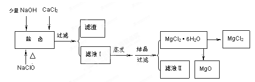 4、填空题 (16分)广东省有着丰富的海洋资源。海水提取食盐和Br2以后的盐卤可以用来制备纯净的MgCl2或MgO。盐卤中含有Mg2+、Cl-,还含有少量Na+、Fe2+、Fe3+、SO42-等。制备流程如下图