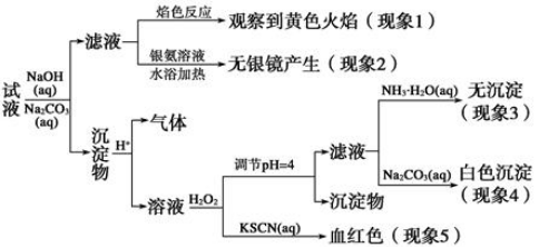 3、推断题 现有一瓶标签上注明为葡萄糖酸盐(钠、镁、钙、铁)的复合制剂,某同学为了确认其成分,取部分制剂作为试液,设计并完成了如下实验:(已知:控制溶液pH=4时,Fe(OH)3沉淀完全,Ca2+、Mg2+不沉淀)该同学得出的结论正确的是