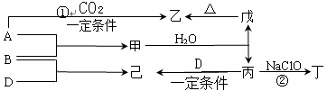 5、填空题 已知:A、B、D为中学常见的单质,只有一种是金属,对应的元素均处在周期表中的短周期;甲、乙、丙、丁、戊、己为短周期元素组成的化合物。其中,丙是一种能使湿润的红色石蕊试纸变蓝的无色气体;丁是一种高能燃料,其组成元素与丙相同,分子中不同原子的个数比为1:2,各原子最外层电子都达到稳定结构;乙是一种耐火材料;己是一种无色气体。