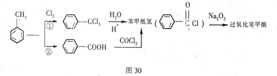 1、填空题 据报道,卫生部决定从2011年5月1日起禁用面粉增白剂。资料显示,目前应用于面粉的增白剂几乎全是过氧化苯甲酰,它能对面粉起到漂白和防腐的作用,且已经过安全评估,但是有研究认为它对人体有一定的负面作用。过氧化苯甲酰的合成路线如下: