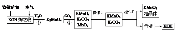 本题解析:(1)上述生产过程中,第①步的反应为:2MnO2+4KOH(熔融)+O2?==2K2MnO4+2H2O,氧化剂为O2;(2)由工艺流程转化关系可知,向K2MnO4溶液中通入CO2制备KMnO4、还生成K2CO3、MnO2,反应只有Mn元素的化合价发生变化,由+6价降低为+4价,由+6价升高为+7价,利用氧化还原方程式的配平原则可写出,3K2MnO4+2CO2= 2KMnO4+2K2CO3+MnO2(3)母液为K2CO3溶液,制取KOH应加入的物质是Ba(OH)2或Ca(OH)2或CaO等;(4)操作Ⅰ为过滤,用到的仪器为漏斗、烧杯、玻璃棒、铁架台(带铁圈),操作II是将两种可溶于性盐分离开,应该是利用物质溶解度的差异,通过浓缩结晶的方法将二者分离开。