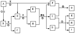 5、推断题 A~J是中学化学中常见的几种物质,它们之间的转化关系如下图所示。已知常温下A为固体单质,B为淡黄色粉末,C、F、I为气态单质,E在常温下为液体,且E可由C、F化合生成,J可作杀菌消毒剂。