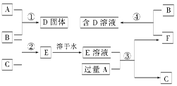 5、填空题 室温下,单质A、B、C分别为固体、黄绿色气体、无色气体,在合适的反应条件下,它们可以按下图所示进行反应,又知E溶液是无色的。请回答: