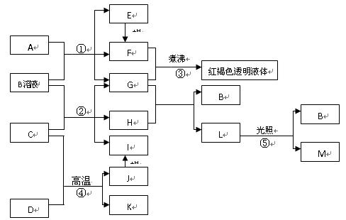 5、填空题 (19分)已知D、M、H是常见的非金属单质,其中M是无色气体,H是有色气体,J是一种金属单质(其同族的某种元素是形成化合物种类最多的元素),A、C是金属氧化物,C和J均是某种常见电池的电极材料,J元素的+2价化合物比+4价化合物稳定,B与C反应时,每生成1molH同时消耗4molB和1molC,K只知含有CO或CO2中的一种或两种。它们关系如图: