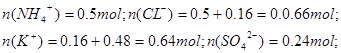 参考答案:C 本题解析:5.6L“人造空气”的质量是2.4g,则22.4L人造空气的质量为2.4×4=9.6g;即混合气体的平均相对分子质量为9.6;利用“十字交叉”法得:物质的量的关系为: 本题难度:一般 2、选择题 在无土栽培液中,每升溶液需用0.5 mol NH4Cl溶液、0.16 mol KCl溶液、0.24molK2SO4溶质作为培养液,若用KCl、NH4Cl和(NH4)2SO4三种物质来配制1.00L上述营养液,所需三种盐的物质的量是?(?) 参考答案:D 本题解析:原混合液中 本题难度:一般 3、选择题 下列关于摩尔的叙述,正确的是 |