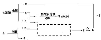 5、填空题 反应①②是重要的化工反应,D、E、F、G为单质,D、E、G、H为气体,且只有E为有色气体,F是常见的金属单质,G是空气中主要成分之一,K是白色胶状沉淀,C的焰色反应为黄色,其物质间的转化关系如下,虚框内是需设计的内容,反应物只能用A~J中的物质:
