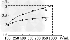 3、选择题 pH=2的两种一元酸x和y,体积均为100?mL,稀释过程中pH与溶液体积的关系如图所示.分别滴加NaOH溶液(c=0.1?mol/L)至pH=7,消耗NaOH溶液的体积为Vx、Vy,则