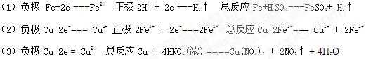 2、填空题 按要求完成下列原电池电极反应式或总反应的化学方程式。 (1)负极(Fe)?;正极(石墨)? 电解质溶液(稀硫酸)总反应? (2)负极(Cu)?; 正极(石墨)? 电解质溶液(FeCl3溶液)总反应? (3)用Fe和Cu作电极材料,以浓HNO3为电解质溶液构成的原电池,则负极的电极反应式为?;总反应为?