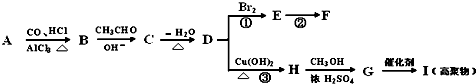 本题解析:本题的突破点有以下几处。首先B通入溴的四氯化碳溶液变为C3H5Br2Cl,所以B为一氯丙烯,A为丙烯。另外B通过氢氧化钠水溶液形成E,所以E为丙烯醇。第二个突破点在A在催化氧化下生成D,而D的相对原子质量为100,所以D为CH3COOCH2=CH=CH2C为乙酸。第三个突破点在于最后I酸化变成C,所以I为乙酸钠,则F为乙酸甲酯,那么倒推回去J为甲醇。第四个突破点在G的分子式中,不饱和度为4,所以含苯环,在催化下与E反应生成甲醇,所以G为苯甲酸甲酯。H及H的聚合物也可以顺利推出。