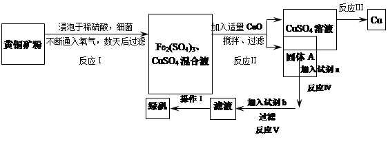 (3)这一问应从工艺流程图的结构入手,通过(1)的分析,已经知道固体A为氢氧化铁,加入试剂a后得到的溶液通过反应v加入b,滤液中的溶质能转化为FeSO4,根据物质的转化原理可知b为Fe。