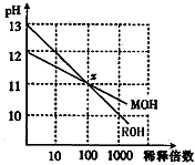 3、选择题 MOH和ROH两种碱的溶液分别加水稀释时,pH变化如图所示。 下列叙述中正确的是
