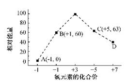 3、填空题 (15分)元素周期表中第ⅦA族元素的单质及其化合物的用途广泛。 (1)与氯元素同族的短周期元素的原子结构示意图为?。 (2)能作为氯、溴、碘元素非金属性(原子得电子能力)递变规律的判断依据是?(填序号)。 a.Cl2、Br2、I2的熔点? b. Cl2、Br2、I2的氧化性 c.HCl、HBr、HI的热稳定性? d. HCl、HBr、HI的酸性 (3)工业上,通过如下转化可制得KClO3晶体: NaCl溶液 NaClO3溶液 KClO3晶体 ①完成I中反应的总化学方程式:□NaCl+□H2O=□NaClO3+□?。 ②Ⅱ中转化的基本反应类型是?,该反应过程能析出KClO3晶体而无其它晶体析出的原因是?。 (4)一定条件,在水溶液中1 mol Cl-、ClO-(x=1,2,3,4)的能量(KJ)相对大小如右图所示。