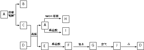 4、简答题 A-J是中学化学常见的物质,它们之间的转化关系如图所示(部分产物已略去).已知A是由两种元素组成的化合物,D是一种红棕色固体,H的焰色反应呈黄色.