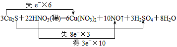 3Cu2S+22HNO3=6Cu(NO3)2+3H2SO4+10NO↑+8H2O