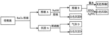 (1)待测液中是否含 、 离子? (2)气体D的化学式为?,反应生成沉淀B的离子方程式为: ? (3)根据以上实验,待测液中肯定没有的离子?;肯定存在的离子是?。