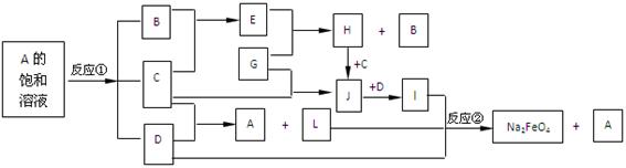 4、填空题 (10分)下图中的反应①是重要的电化学工业反应,反应②可用于制备新型消毒净水剂Na2FeO4。常温下B、C为气态单质,G是当代社会使用量最大的金属,其余均为化合物。(反应时加入或生成的水,以及生成沉淀I时的其他产物均已略去) 。