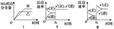 2SO3(g)的正反应是放热反应,所以若升高温度,平衡向吸热反应方向即向逆反应方向移动,所以达到平衡时SO3的含量降低,乙的温度较高,错误;B.若使用催化剂,正反应速率和逆反应速率都增大,而且增大的倍数相等,所以平衡不发生移动,所以图Ⅱ表示t0时刻使用催化剂对反应速率的影响,正确;C.若通入氦气,由于物质的浓度不变,所以化学反应速率不变,错误;D. t0时刻增大O2的浓度,在那一瞬间,反应物的浓度增大,正反应速率增大,而逆反应速率不变,所以平衡正向移动,与图像不符合,错误。