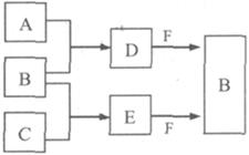 2、填空题 (8分) A、B、C是三种常见短周期元素的单质。常温下D为无色液体,E是一种常见的温室气体。其转化关系如图(反应条件和部分产物略去)。试回答: