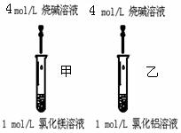 实验二:如右图,甲乙试管中分别加入2ml 1mol/L MgCl2和AlCl3溶液,用胶滴管逐滴滴加5mol/L NaOH溶液至过量。