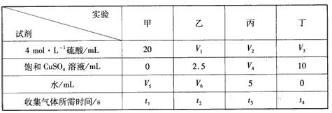 4、选择题 实验室用Zn与稀硫酸反应来制取氢气,常加入少量CuSO4来加快反应的速率。为了研究 CuSO4的量对生成H2速率的影响,某同学设计了如下实验方案(见下表),将表中所给的试剂按一定体积混合后,分别加入四个盛有相同大小的Zn片(过量)的反应瓶(甲、乙、丙、丁)中,收集产生的气体,并记录收集相同体积的气体所需的时间。下列说法正确的是?