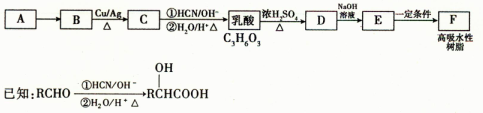 5、填空题 A是一种常见的烃,标准状况下,A对氢气的相对密度是14.乳酸是一种常见的有机酸,用途广泛.高吸水性树脂F是一种高分子材料,可用于干旱地区抗旱保水、改良土壤、改造沙漠,还可制作尿不湿.下图是由A为原料制取高吸水性树脂F的合成路线图: