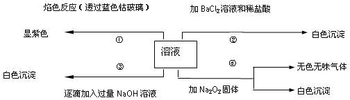 4、填空题 (13分)有一无色溶液,可能含有Fe3+、Al3+、Fe2+、Mg2+、Cu2+、NH4+、K+、CO32-、SO42-等离子的几种,为分析其成分,取此溶液分别进行了四个实验,其操作和有关现象如下图所示: