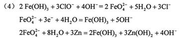 (4)根据题意,FeCl3与KClO在强碱性条件下反应可制取K2FeO4,根据元素守恒、电子转移守恒,可得反应的离子方程式。根据原电池反应原理,锌做负极材料,失电子,发生氧化反应;K2FeO4在电池中作为正极材料,得电子,发生还原反应。