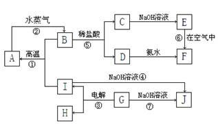 1、填空题 (14分)A~I分别表示中学化学中常见的一种物质,它们之间相互关系如下图所示:已知G在生产中可作为一种耐火材料,F是红褐色难溶于水的沉淀,A、B、C、D、E、F六种物质中均含同一种元素,其中I+B→A+G属于置换反应。(部分反应物、生成物没有列出)。