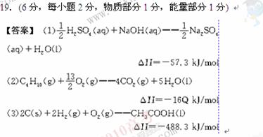 参考答案:A 本题解析:由图示可知:(1)断裂 mol N2(g)和mol H2(g)中的化学键共吸收a kJ的能量,由1 mol N和3 mol H生成1 mol NH3(g)放出b kJ的能量,由1 mol NH3(g)变为1 mol NH3(l)放出c kJ能量;(2)由mol N2(g)和mol H2(g)生成1 mol NH3(g)或1 mol NH3(l)均放出能量。故有①N2(g)+H2(g) 本题难度:一般 4、填空题 (每空4分,共12分) 参考答案:(1)TiO2(s)+2Cl2(g)+2C(s)=TiCl4(l)+2CO(g) ΔH=-81 kJ·mol-1, 本题解析:(1)根据盖斯定律,一式加二式可得;TiO2(s)+2Cl2(g)+2C(s)=TiCl4(l)+2CO(g) ΔH=-81 kJ·mol-1;(2)燃烧热是1mol物质完全燃烧生成稳定化合物时放出的热量,则CO的燃烧热的热化学方程式为CO(g)+1/2O2(g)=CO2(g) △H=-280kJ/mol(3)根据图像可知,该反应是放热反应,反应的热化学方程式为N2H4(g)+ O2(g) =N2(g)+2H2O (g) △H=-534kJ/mol。 本题难度:一般 5、选择题 下列热化学方程式书写及说法正确的是 |