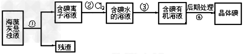 4、选择题 海藻中含有丰富的、以离子形式存在的碘元素。下图是实验室从海藻里提取碘的流程的一部分。
