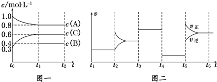 4、简答题 向一体积不变的密闭容器中加入2mol?A、0.6mol?C和一定量的B三种气体.一定条件下发生反应,各物质浓度随时间变化如图一所示.图二为t2时刻后改变反应条件,平衡体系中反应速率随时间变化的情况,且四个阶段都各改变一种不同的条件.已知t3~t4阶段使用了催化剂;图一中t0~t1阶段c(B)未画出.
