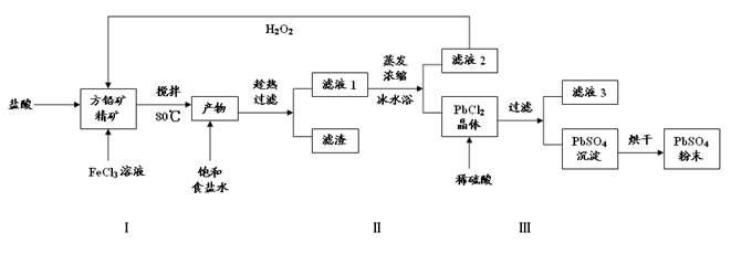 (4)滤液2的主要成分是氯化亚铁,与过氧化氢反应又生成氯化铁,作氧化剂使用,离子方程式为2Fe2++ H2O2+2H+=2Fe3++2H2O;由(3)可知氯化铅转化为硫酸铅同时生成氯化氢,所以滤液3是盐酸溶液;