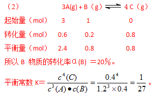 (4)再充入a mol C,相对于又充入了3/4amolA和1/4amolB,因为反应前后体积,而此时A和B的物质的量的之比仍然满足3︰1,故平衡与最初的平衡等效,因此B的转化率还是20%,故达到新平衡,B的物质的量为(1+0.25a)mol×80%=(0.8+0.2a)mol。