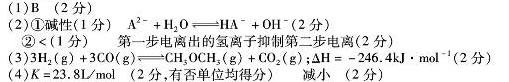 (2)某二元酸H2A在水中的电离方程式是:H2A=H++HA-;HA- H++A2-,请回答下列问题:①Na2A溶液显_________(填“酸性”、“中性”或“碱性”),理由是________________ (用离子方程式表示)。 ②已知0.1 mol·L-1的NaHA溶液的pH=2,则0.1mol·L-1的H2A溶液中氢离子的物质的量浓度可能是__________0.1lmol·L-1(填“<”、“>”或“=”),理由是:___________________________.(3)二甲醚是一种重要的清洁燃料,利用水煤气合成二甲醚的三步反应如下: ①2H2(g)+CO(g) CH3OH(g); △H=-90.8kJ·mol-1②2 CH3OH(g) CH3OCH3(g)+H2O(g); △H=-23.5kJ·mol-1③CO(g)+H2O(g) CO2(g)+H2(g);△=-41.3kJ·mol-1写出水煤气直接合成二甲醚同时生成CO2的热化学反应方程式___________________. (4)SO2是硫酸生产的重要中间产物,也是空气污染的主要原因之一,其氧化生成SO3的反应为:2SO2(g)+O2(g) 2SO3(g)。在一定温度下,将0.23 mol SO2和0.11 mol氧气放入容积为l L的密闭容器中发生反应,达到平衡后得到0.12 mol SO3,则反应的平衡常数K=________。若温度不变,再加入0.50 mol氧气后重新达到平衡,则SO3的体积分数将___________(填“增大”、“不变”或“减小”)。参考答案: 本题解析:略 本题难度:一般 4、填空题 类比是化学学习中常用的方法之一,已知硝酸能把铁氧化成 Fe ( NO3)3、,但当铁过量时,产物是 Fe ( NO3 ) 2。某同学受此启发,提出一个相似的观点:氯气与铁粉反应,当 C12足量时生成 FeC13 , 当铁粉过量时产物是 FeCl2。为验证该观点是否正确,该同学将一根细的纯铁丝分别在足量和少量的 C12中点燃,取其表面生成物并分别编号为 A、B ,然后通过实验确定其成分。探究过程如下: 参考答案:(2)溶液变红色(1分) FeCl2 ( 1 分) ( 3 ) 2Fe十3Cl2 本题解析:Fe3+遇SCN一变红色。 Fe2+能使 KMnO4溶液褪色; FeC13溶液加人铁粉,将三价铁还原为二价铁,颜色变浅; FeC13溶液加热蒸干最后得到的是三氧化二铁, ( 5 )向废液中加人过量的铁粉,铁粉首先和三价铁离子反应,将其转化为二价铁离子,然后和铜离子反应,再加人盐酸,盐酸和过量的铁粉反应生成二价铁离子,由此知四种离子的氧化性由强到弱的顺序为Fe3+ >Cu2+ > H+ >Fe2+,方案 2 中用铜作阴极,电极上的反应为2Fe3++2e一=2Fe2+,然后 Cu2++2e一=Cu , 2H+十2e一=H 2↑ , 不足之处,阳极会产生氯气污染,会消耗大量的电能等。 本题难度:一般 5、选择题 下列实验操作中,错误的是 参考答案:C 本题解析:A 正确,加入碎瓷片,会防止暴沸 本题难度:一般 |