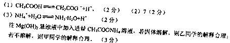 (3)饱和氯化铵溶液显酸性,原因是(用离子方程式表示)?;向饱和氯化铵溶液中加入少量Mg(OH)2固体,固体完全溶解。甲、乙两位同学分别提出了不同的解释: