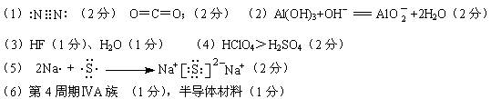 5、填空题 (9分)A、B、C、D、E、F六种短周期主族元素,它们的原子序数依次增大。已知:A元素的原子半径最小,B元素原子的最外层电子数是内层电子数的2倍,C元素的最高价氧化物对应的水化物与其氢化物反应能生成盐,D与E同主族,E元素原子的最外层电子数比次外层电子数少2。请回答: